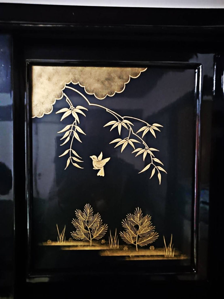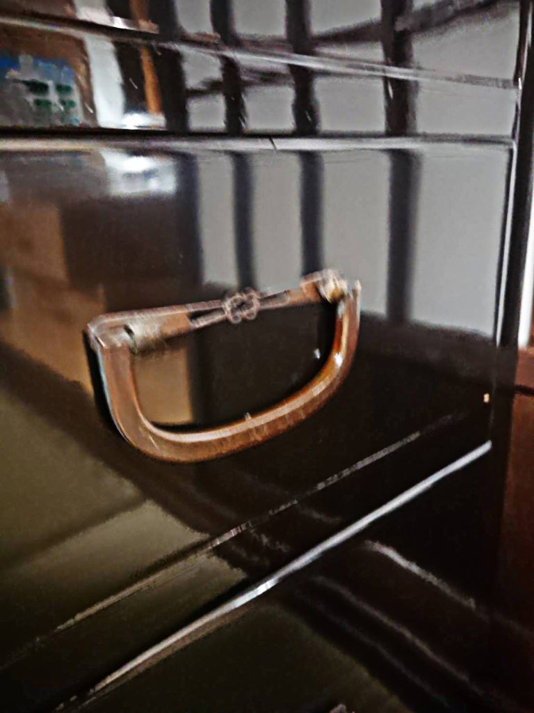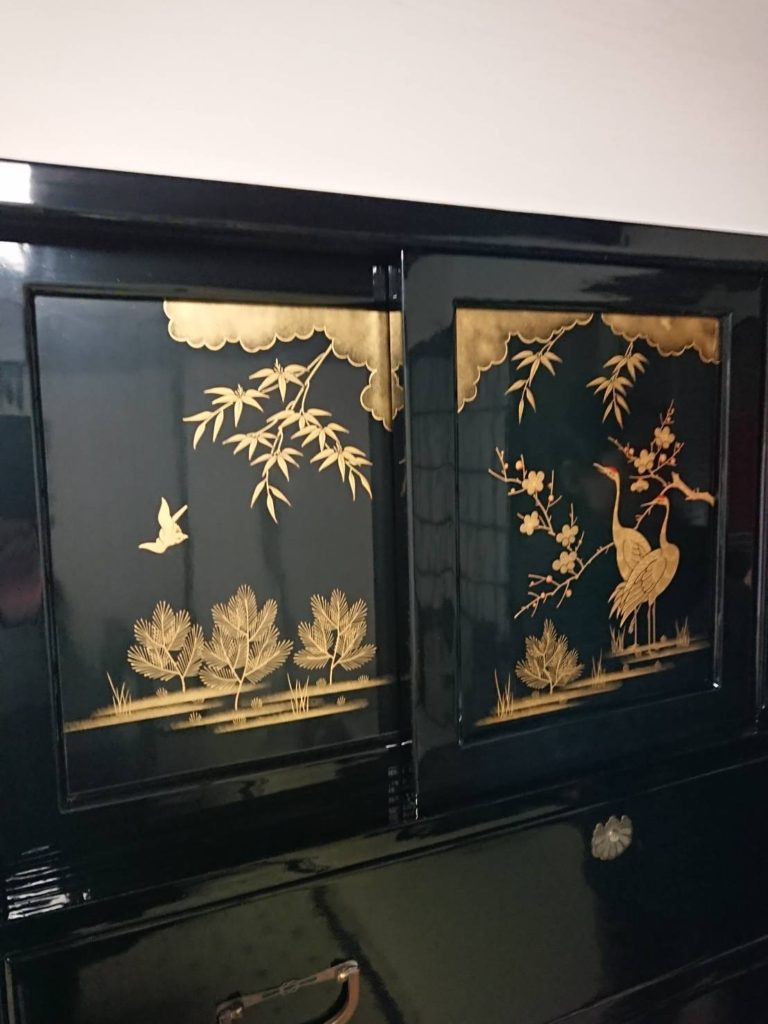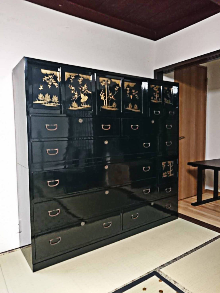 丁寧に仕上げられた、白木のままの生地箪笥は、塗りを施されますが、蝋を塗り込んだ白木仕上げに、拭き漆仕上げ、黒漆塗りを施したものがありました…。特にその後に蒔絵を入れた豪華な仕上げの箪笥もありました…。桐箪笥(杉と松と桐を併用)にはヤシャブシと砥粉を塗った後に天然蝋の本イボタ蝋で仕上げていました。